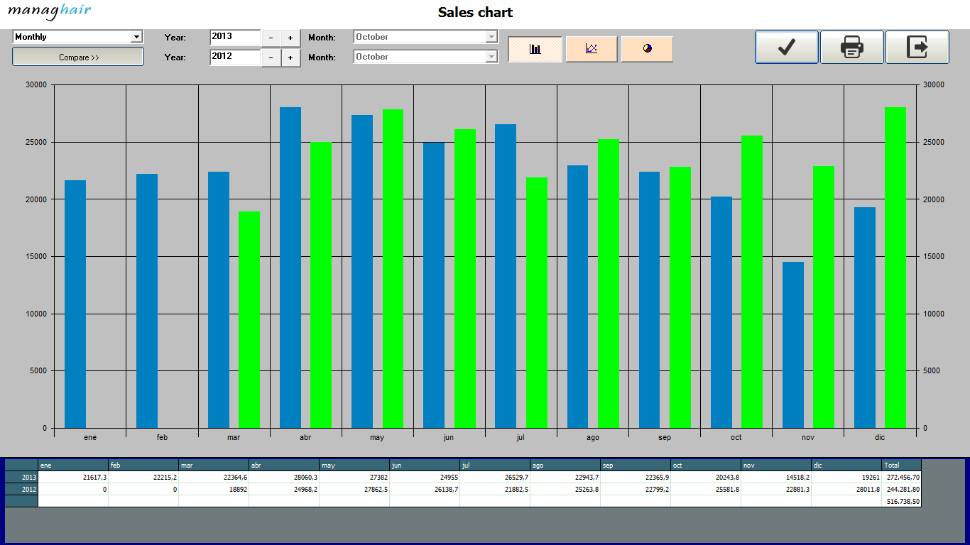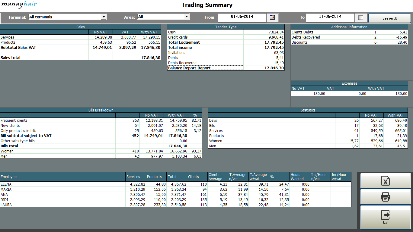 See your employees figures, their average ticket, clients attended and if you use managhair agenda, you may even know about their figures per working hour.