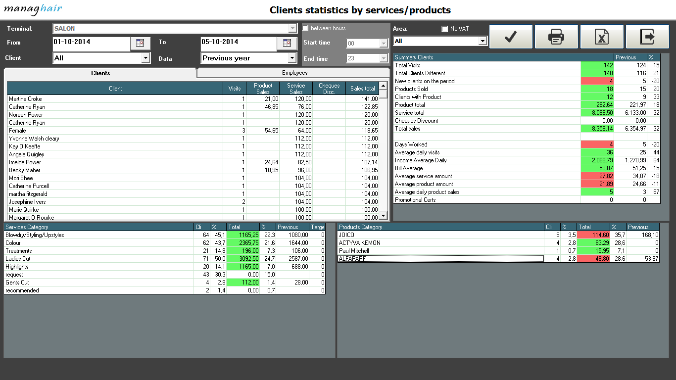 With this report you will exactly know how many clients visit the salon, percentages and how much they spend on services and products.